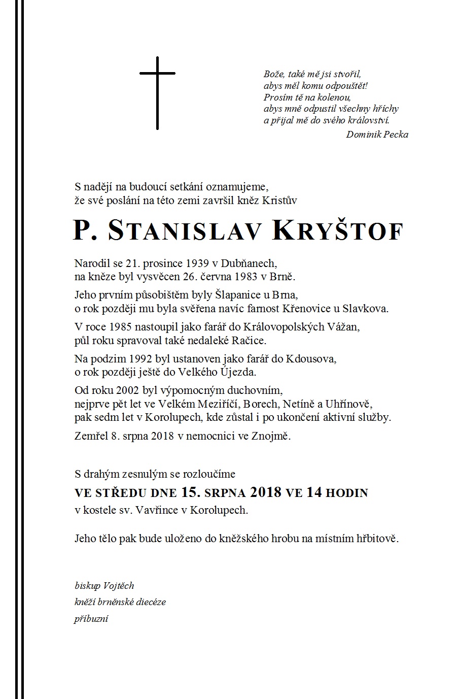 P.Stanislav Kryštof, narodil se v Dubňanech 21. prosince 1939. Vysvěcen na kněze 26. 6. 1983 olomouckým biskupem Josefem Vranou v Brně. Primiční mši svatou měl v Dubňanech 3. července 1983. Jeho prvním působištěm byly Šlapanice u Brna, o rok později mu byla svěřena navíc farnost Křenovice u Slavkova. V roce 1985 nastoupil jako farář do Královopolských Vážan, půl roku spravoval také nedaleké Račice. Na podzim 1992 byl ustanoven jako farář do Kdousova, o rok později ještě do Velkého Újezda. Od roku 2002 byl výpomocným duchovním, nejprve pět let ve Velkém Meziříčí, Borech, Netíně a Uhřínově, pak sedm let v Korolupech, kde zůstal i po ukončení aktivní služby. Zemřel 8. 8. 2018 v nemocnici ve Znojmě. Pohřben byl do starobylého kněžského hrobu v Korolupech, místě jeho posledního působení.